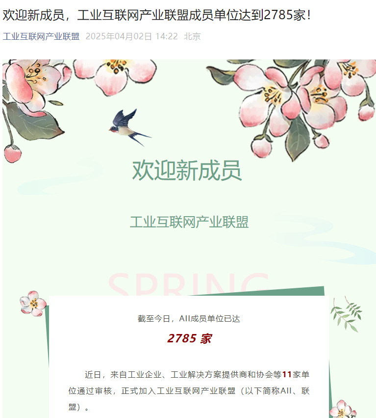 2025 年 4 月 2 日,工業(yè)互聯(lián)網(wǎng)產(chǎn)業(yè)聯(lián)盟(AII)宣布,青島中電綠網(wǎng)新能源有限公司成功通過(guò)審核,正式成為聯(lián)盟新成員。這標(biāo)志著青島中電綠網(wǎng)新能源有限公司在工業(yè)互聯(lián)網(wǎng)領(lǐng)域獲得權(quán)威認(rèn)可,開啟發(fā)展新征程。